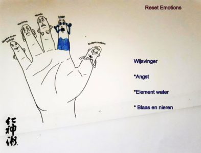 - Element water. We zeggen ook wel van angst in je broek plassen. Zo kun je bijvoorbeeld bij de tandarts je wijsvinger vasthouden. Je zult zien dat de angst verminderd, en de pijn daardoor minder wordt.